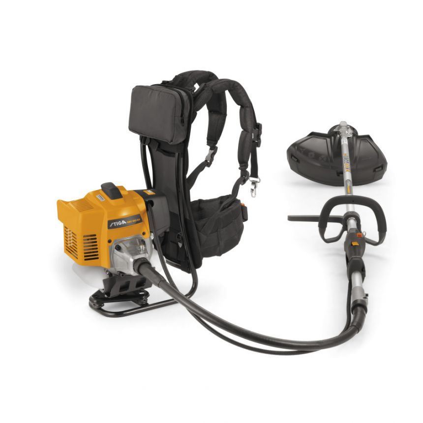 Decespugliatore STIGA modello SBC 653 KF con motore a scoppio Kawasaki 2 tempi da 53,2 cc con asta di trasmissione dritta, impugnatura singola con comandi e larghezza di taglio di 43 cm. Decespugliatore a zaino.