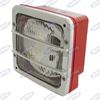 Proiettore simmetrico con luce abbagliante e anabbagliante. Corpo arancione e cornice nera. Fissaggio a molla.