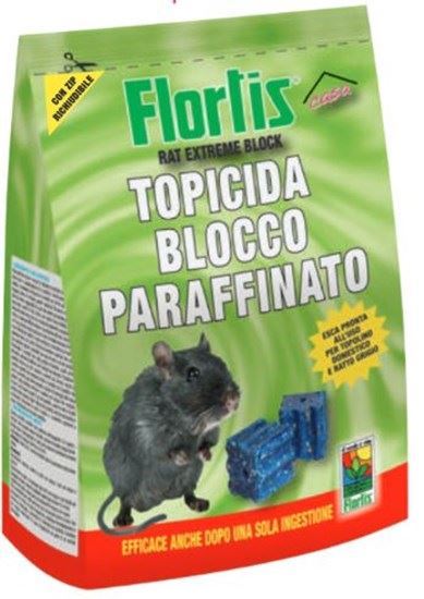 Il topicida blocco paraffinato 300gr è un'esca rodenticida pronta all'uso a base di una sostanza anticoagulante (Brodifacoum), efficace contro i topolini domestici e il ratto grigio. Efficace anche dopo una singola ingestione.